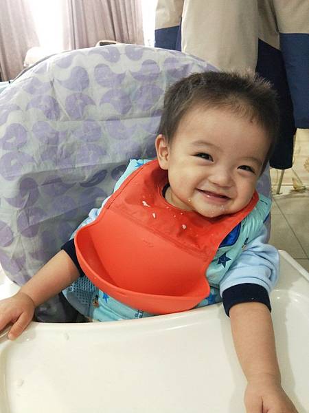 有一天帶他去餐廳時,給他吃了人生第一碗炒飯,當天還有配一些青菜和雞湯(老實說有點油),回到家爸爸還加碼給他吃了一口冰和布丁~